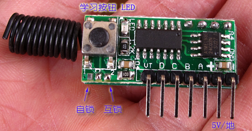 編碼芯片為:2262 2260 5026-1 5026-2 5026-3 5026-4 FP527 SMC918 PT2240 EV1527 HT12D HT12E等芯片的遙控器都能和學(xué)習(xí)型的接收板配套,只要按住學(xué)習(xí)鍵約1秒,旁邊的貼片LED閃爍,此時只按下遙控器任意一個鍵,LED熄滅表示學(xué)習(xí)成功;可學(xué)習(xí)8個以上不同編碼的遙控器并且能永久記憶。如果連續(xù)按住學(xué)習(xí)鍵8秒,可以刪除所有學(xué)習(xí)成功的地址碼。