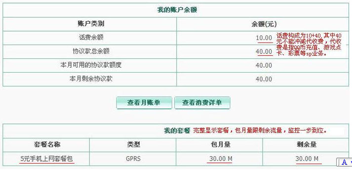 1、話費構成說明。面值50元設置為10+40,濰坊移動為了防止SP自消費,在話費設置上做了10+40,其中10元自由消費,40元協(xié)議款,規(guī)定40元不能用來沖減代收費業(yè)務,代收費業(yè)務是指QQ幣充值、彩票投注、游戲點卡等SP結算業(yè)務,只能用來沖減移動通話費、短信費、GPRS包月費用。對于GPS客戶,40元可以正常沖減5元包30M GPRS包月費用。