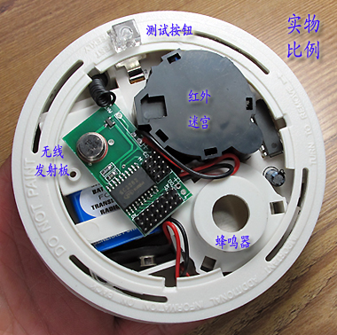 無(wú)線(xiàn)火災(zāi)煙霧傳感器從功能上說(shuō)已經(jīng)非常完整獨(dú)立,可以作為一個(gè)火災(zāi)煙霧報(bào)警器使用了,因?yàn)樗具備無(wú)線(xiàn)報(bào)警功能,所以能和我們網(wǎng)站銷(xiāo)售的小衛(wèi)士818家庭報(bào)警器或者八防區(qū)報(bào)警器配套使用,上圖中長(zhǎng)方形綠色的小電路板是無(wú)線(xiàn)發(fā)射板,使用時(shí)需要打開(kāi)報(bào)警器的外殼設(shè)置地址碼和數(shù)據(jù)碼,客戶(hù)可以將頂蓋邊緣的三個(gè)爪口向內(nèi)按住,便可向上取下頂蓋看到無(wú)線(xiàn)發(fā)射板,藍(lán)色箭頭所指示的是2262芯片的振蕩電阻,我們默認(rèn)為4.7M,客戶(hù)如果和其他系統(tǒng)配套時(shí)可以自行更換。將8位地址碼和4位數(shù)據(jù)碼和報(bào)警系統(tǒng)設(shè)成一致即可聯(lián)網(wǎng)工作。