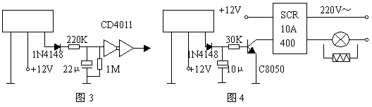 當(dāng)有人站在取款機前時紅外線反射型傳感器輸出高電平,并通過RC網(wǎng)絡(luò)延時數(shù)秒,確認(rèn)來人是取款而不是經(jīng)過時,給PC機送去高電平,由PC控制電機啟動,保護玻璃抬起。當(dāng)取款人走后,紅外線反射型傳感器轉(zhuǎn)為低電平,RC網(wǎng)絡(luò)在數(shù)秒后也輸出低電平,PC再控制電機使保護玻璃降下來。從而完成對自動取款機的保護。見圖3。