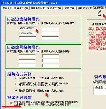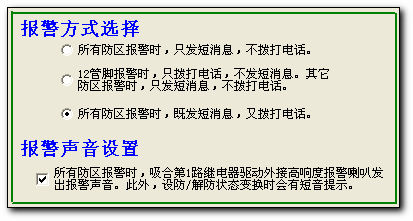 在設置軟件的“報警設置1”內寫入接收報警短信的手機或者小靈通號碼,選擇“所有防區(qū)報警時,既發(fā)短消息,又撥打電話”如果勾選了報警聲音設置后,可以在報警后自動發(fā)出15秒的高響度報警聲音(需要外接警笛)。在“報警設置2”中可以修改報警短信的內容。