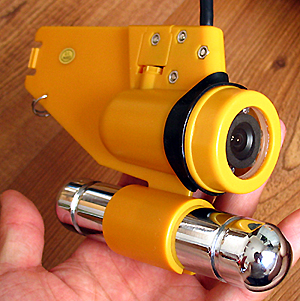 攝像機(jī)底部發(fā)亮的金屬物體是重力棒,是用來平衡攝像機(jī)在水中的浮力,使攝像機(jī)處于垂直姿態(tài),重力棒上有三道凹槽,卡在不同的槽可以改變攝像機(jī)的重心,可以使攝像機(jī)保持上仰30度、水平、下俯30度,攝像機(jī)背后有尾翼,使攝像機(jī)在水流中能比較穩(wěn)定,水下電纜的長(zhǎng)度為20米。