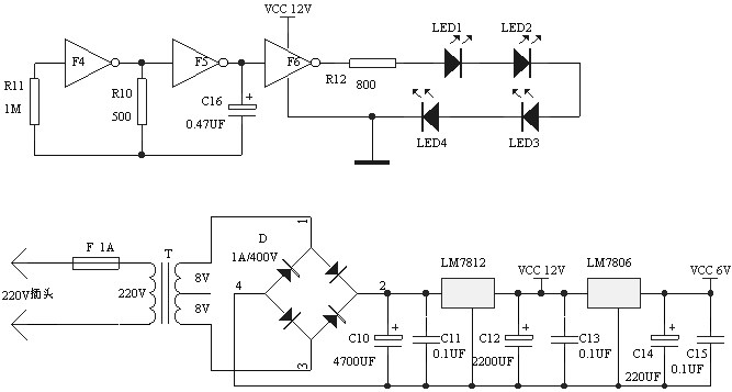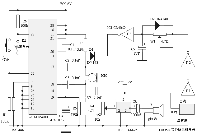 工作原理:圖1(電源和電路.JPG)是語音介紹機的電源部分,交流電源經(jīng)過1安培的保險器F通過變壓器B降壓、D整流后由LM7812和LM7806穩(wěn)壓獲得12V和6V直流電源。圖2(商品叫賣.JPG)中的TX05D是紅外線發(fā)射、反射檢測開關(guān),體積僅為32mmX17mmX48mm,模塊的輸出是一根一米左右的雙芯屏蔽線,其中紅線接正電源,白線為輸出,屏蔽層銅網(wǎng)接地,它的優(yōu)點是工作可靠、檢測距離比較遠,當工作電壓為12V時檢測距離可以在20~100厘米之間可調(diào),可以根據(jù)促銷現(xiàn)場的實際情況調(diào)整動作距離,使顧客接近到商品一定距離內(nèi),顧客的身體將TX05D發(fā)射的紅外線光束反射到紅外線接收三極管內(nèi),TX05D動作,輸出高電平,通過非門F1、F2反相及電平整形后由電位器W1向C9充電,充電電路的時間常數(shù)約3秒左右,可以通過調(diào)整W1改變延時觸發(fā)時間,如果顧客只是從商品前方經(jīng)過,因為停留的時間小于3秒,C9兩端的電壓還未達到F3的翻轉(zhuǎn)電平時,F(xiàn)2已經(jīng)變成低電平,C9兩端的電壓被二極管D2瞬間泄放掉。當顧客停留時間超過3秒時F3翻轉(zhuǎn)輸出低電平觸發(fā)語音電路APR9600工作,D1為反相隔離二極管。APR9600是臺灣公司推出的新型:音質(zhì)好、噪音低、不怕斷電、可反復(fù)錄放的新型語音電路,采用DIP28雙列直插塑料封裝。它的工作方式非常靈活,通過第24、25、9腳的不同電平設(shè)置可以有多種工作模式,這里將24、25、9腳都接地電平,是接成串行選段控制方式,只是這里只錄入一段語音,所以當1腳被低電平觸發(fā)后,芯片播放出僅有的一段語音,錄入語音的時間和芯片的振蕩電阻R2有關(guān),電阻越大,錄入語音的時間越長,但是音質(zhì)會隨錄放時間加長而變差,當振蕩電阻為24K時錄放時間為32秒,當振蕩電阻為44K時錄放時間為60秒。APR9600芯片本身能夠直接驅(qū)動揚聲器工作,不過功率比較小,只有50毫瓦,在人聲嘈雜的商店里根本聽不清,所以增加了LA4425作為功率放大電路,圖3(La4425.JPG)是LA4425的外形引腳圖,LA4425音頻功率放大集成電路的特點是外圍元件很少,只需一個輸出耦合電容就能向8歐姆的揚聲器提供5W的不失真功率,通過調(diào)整音量電位器W2可以播放出清晰、洪亮的介紹語音。門電路F4、F5、F6共同組成一個低頻振蕩器,驅(qū)動超高亮度發(fā)光二極管閃爍,發(fā)光二極管可以布置在展臺座的四周,起到裝飾作用。