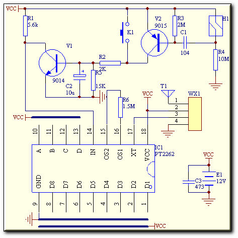 電路中的H1是一個(gè)干簧管,當(dāng)門關(guān)閉的時(shí)候,H1吸合C1兩端電位相同,V2截止,V1也截止。當(dāng)門被打開后,干簧管觸點(diǎn)打開有一個(gè)電流通過(guò)V2的發(fā)射結(jié)、R3(和R3并聯(lián))—C1—R4—地,流過(guò)V1發(fā)射結(jié)的電流使得V1導(dǎo)通,其集電極的電流通過(guò)R2流入R3和V1的基極,由于流進(jìn)V1基極的電流較大,加之著的集電極電阻較大,V1飽和導(dǎo)通。IC1接在其集電極上的14腳電位被拉低。P她262的特點(diǎn)是:當(dāng)14腳電壓被拉低后,其17腳輸出脈沖數(shù)據(jù)調(diào)制信號(hào)到無(wú)線發(fā)射模塊WX1的調(diào)制極上,被調(diào)制的高頻信號(hào)通過(guò)天線發(fā)射出去。IC1輸出的調(diào)制信號(hào)中包含地址碼和數(shù)據(jù)碼兩部分,地址碼有D1-D8通過(guò)接地、接正極和懸空3中狀態(tài)所決定,數(shù)據(jù)碼通過(guò)與正極連接所決定,連接正極,其位數(shù)據(jù)是“1”,不連接的位數(shù)據(jù)是“0”。