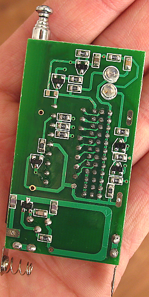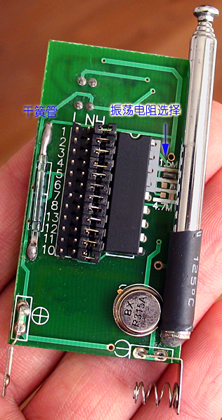 天線是一根長(zhǎng)度為23厘米的軟導(dǎo)線,需要焊接到天線焊盤上,圖中紅色箭頭所指的是振蕩電阻,這里用的是200K,可以和1.2M的發(fā)射端配合。