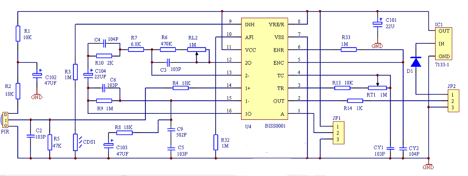 BISS0001的熱釋電紅外開關(guān)應(yīng)用電路圖