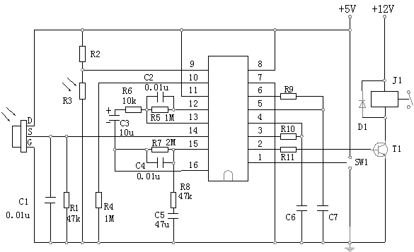 上圖中,R3為光敏電阻,用來檢測環(huán)境照度。當(dāng)作為照明控制時(shí),若環(huán)境較明亮,R3的電阻值會(huì)降低,使9腳的輸入保持為低電平,從而封鎖觸發(fā)信號(hào)Vs。SW1是工作方式選擇開關(guān),當(dāng)SW1與1端連通時(shí),芯片處于可重復(fù)觸發(fā)工作方式;當(dāng)SW1與2端連通時(shí),芯片則處于不可重復(fù)觸發(fā)工作方式。圖中R6可以調(diào)節(jié)放大器增益的大小,原廠圖紙選10K,實(shí)際使用時(shí)可以用3K,可以提高電路增益改善電路性能。輸出延遲時(shí)間Tx由外部的R9和C7的大小調(diào)整,觸發(fā)封鎖時(shí)間Ti由外部的R10和C6的大小調(diào)整,R9/R10可以用470歐姆,C6/C7可以選0.1U。