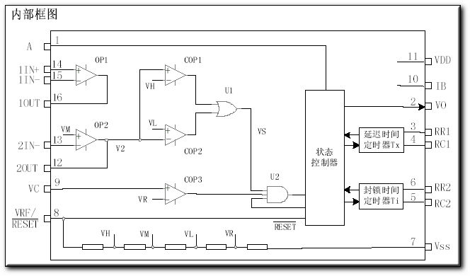 COP3是一個(gè)條件比較器。當(dāng)輸入電壓Vc<VR(≈0.2VDD)時(shí),COP3輸出為低電平封住了與門U2,禁止觸發(fā)信號(hào)Vs向下級(jí)傳遞;而當(dāng)Vc>VR時(shí),COP3輸出為高電平,進(jìn)入延時(shí)周期。