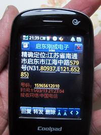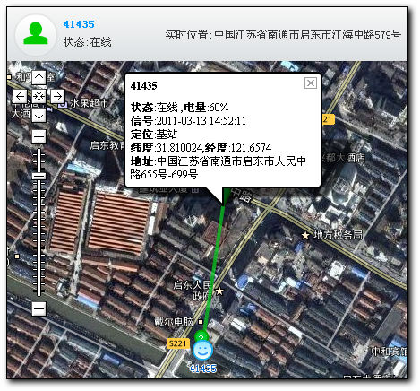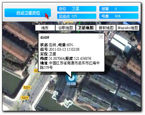 大家可以看到,藍(lán)色笑臉是實(shí)際手機(jī)的位置,上方的綠色氣球處是LBS基站定位成功的地點(diǎn),誤差約100米,我們再點(diǎn)擊網(wǎng)頁監(jiān)控平臺的“啟動衛(wèi)星定位”按鈕,遠(yuǎn)程開啟GPS進(jìn)行精確定位。約3分鐘后我們驚奇地看到GPS衛(wèi)星精確定位成功了,誤差肯定小于10米。而且地圖的清晰程度也是遠(yuǎn)遠(yuǎn)超出想象,可以看到啟東剛成電子有限公司所在的25層大樓的南面是一條城市景觀河,大樓就位于江海橋旁邊,周圍的景物非常清晰哦。在監(jiān)控平臺上我們可以看到電池的當(dāng)前電力、所在地點(diǎn)的經(jīng)緯度和路名等等信息。