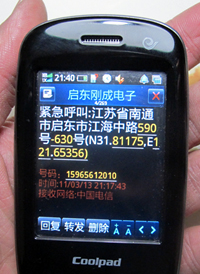按下SOS按鈕后,設(shè)置成SOS號碼的手機(jī)會收到一條位置短消息,如果用SOS號碼的手機(jī)編輯發(fā)送DW的短信,會收到一條精確定位的短消息。
