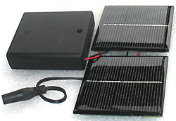 這是我們DIY的太陽能充電器,選用了2塊8V/100毫安的太陽能電池,各經過一個隔離二極管給4節(jié)鎳氫電池充電,做好后的太陽能電池背面可以貼透明膠帶,防止損壞和意外短路,而且電池板還可以折疊,減小體積。